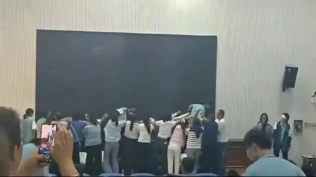 现场视频显示,家长们在地上跪成一排,学生疑似蒙眼在众人搀扶下从家长背上踩过。活动现场配有抒情背景音乐,视频里传来:“走吧!走吧!”